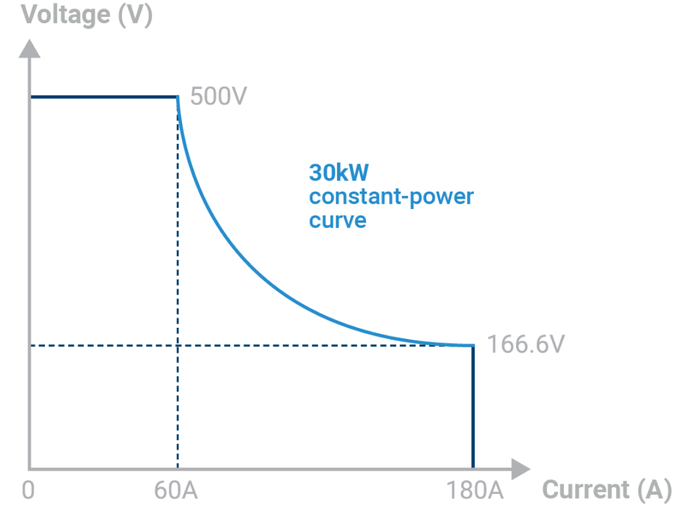 All EA 19” rack mounted electronic loads provide true autoranging giving full power across a larger operating range. Autoranging enables the load to automatically adapt to higher output voltages when there is a smaller current or handle higher currents when there is a lower voltage. EA’s true autoranging can deliver full power down to 33% of rated output voltage.
